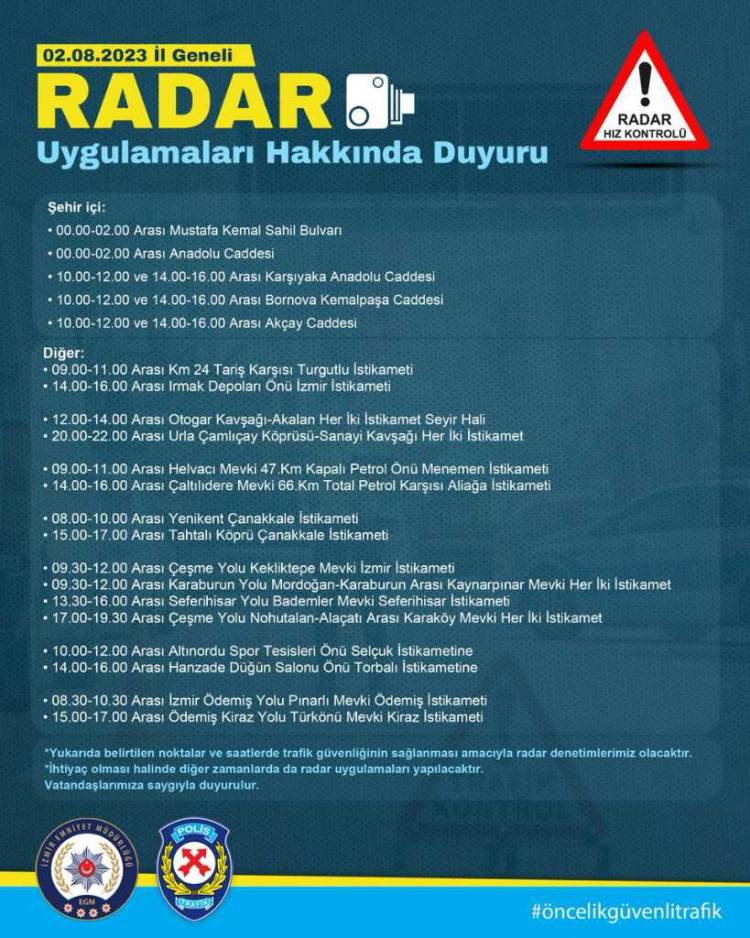 02.08.2023 günü İzmir genelinde gerçekleştirilecek olan radar uygulamaları hakkında duyuruda bulundu.